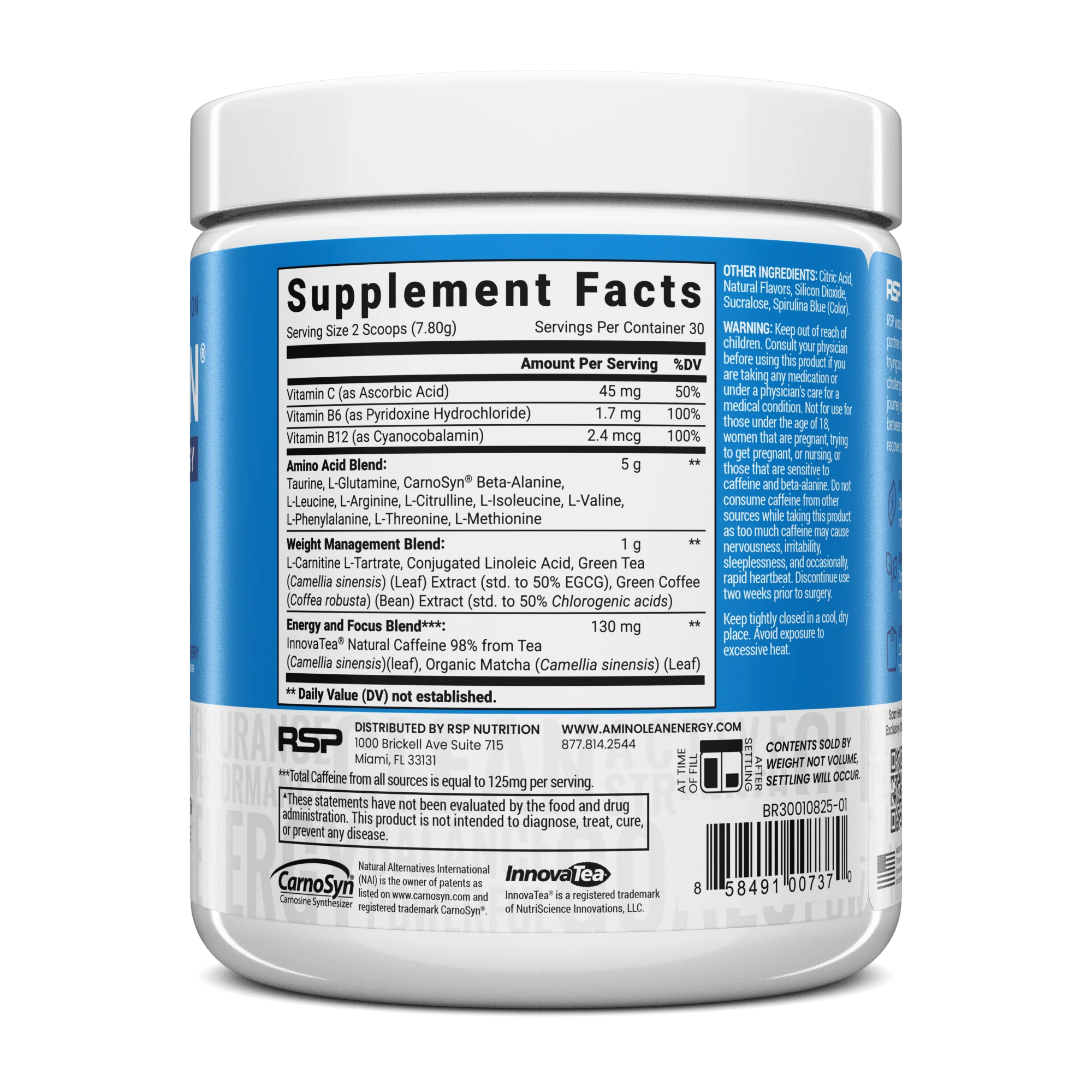 The Energy and Focus Blend features natural caffeine from green tea for a clean, sustained anytime energy boost. The comprehensive Amino Acid Blend contains BCAAs and essential amino acids to help build and sustain lean muscle. The Weight Management Blend contains CLA and L-Carnitine which break down body fat and convert it to a usable energy for the body. The end result is a great tasting, easy-to-mix, healthy supplement that you can take any time to boost energy, build muscle and burn fat. Use AminoLean Energy Formula to take your daily performance to a new level and achieve your fitness goals.Â