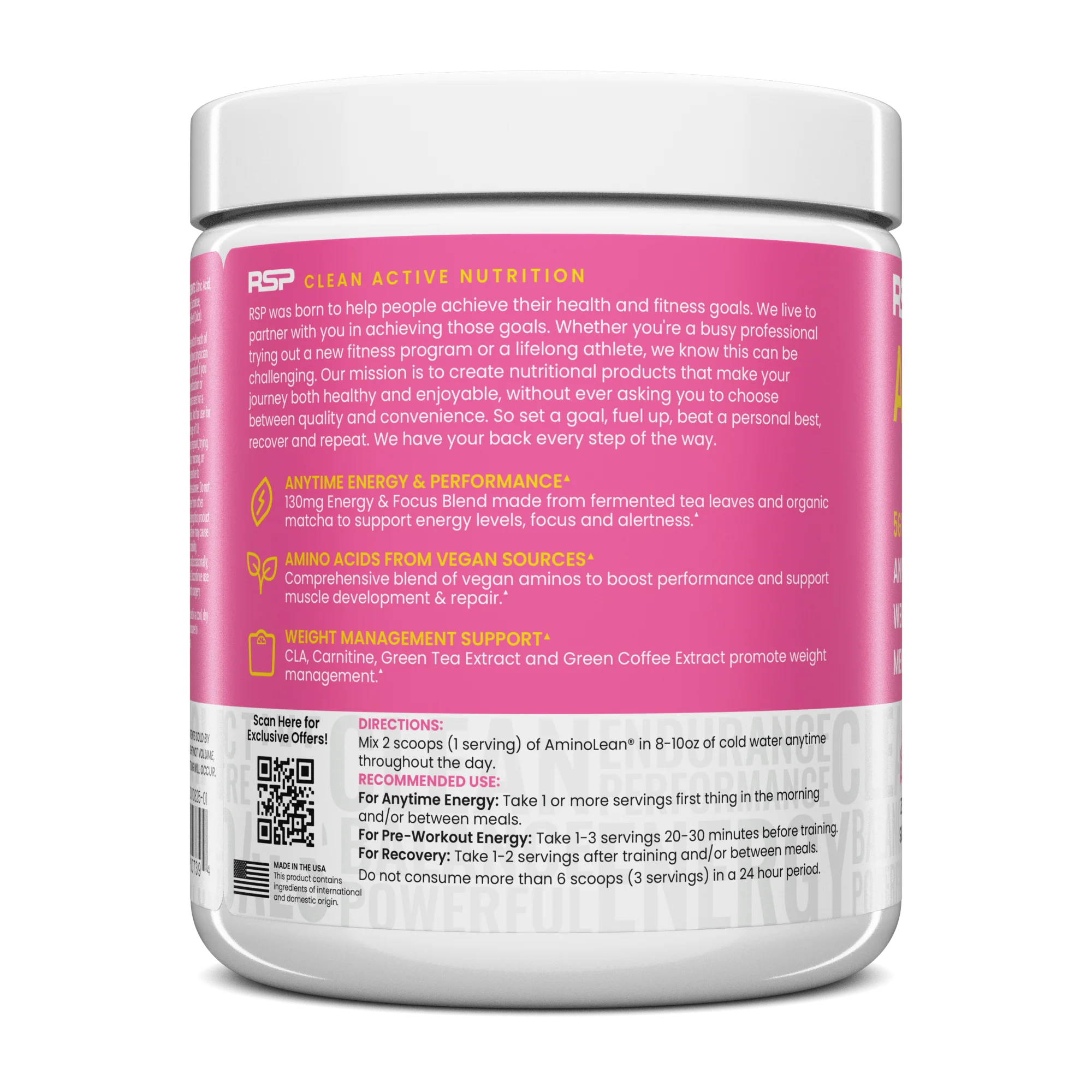 Improve energy levels and exercise performance with AminoLean, an all-in-one pre workout and energy solution. Take AminoLean 20-30 minutes before your workout to improve focus and performance. AminoLean can be taken on both training and non-training days for energy, weight management, and muscle recovery.